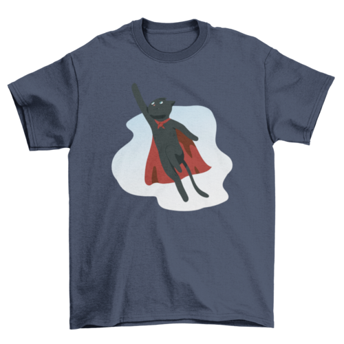 Super Hero Cat T-Shirt Design featuring an illustration of a black cat flying wearing a red cape.