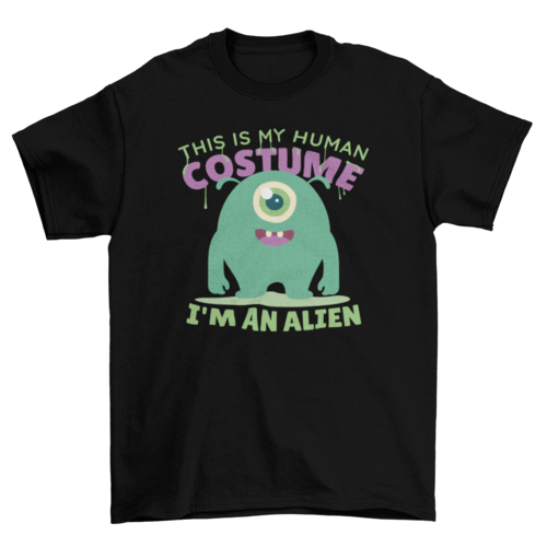 Cute t-shirt design featuring a green alien with the quote "This is my human costume, I'm an alien".